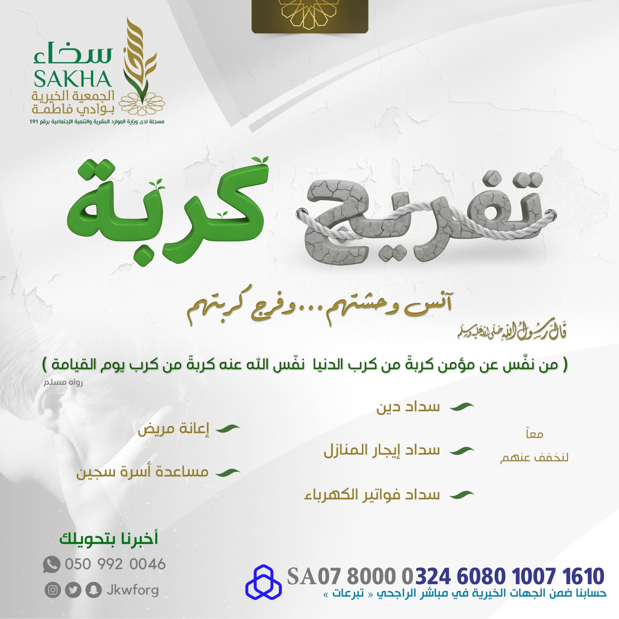هناك أُسر تتعرض لكُرب الحياة وبحاجة إلى من يفرج كربتهم، فكن انت، مستشعراً حديث البني ﷺ ( من نفس عن مؤمن كربة من كرب الدنيا ، نفس الله عنه كربة من كرب يوم القيامة ... الحديث)